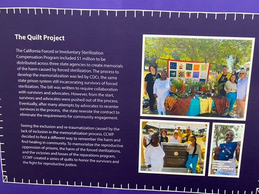 Another feature of this historic and groundbreaking bill was to memorialize the harm done by the state and educate the public on eugenics. The bill mandated the involvement of survivors and advocates, with the intent to center the needs and desires of survivors in the process. However, most felt shut out of the process; their voices left unheard. CCWP instead came together to create a memorial quilt. Titled, Together We Rise, Together We Heal, this series of quilts was created by survivors and advocates inside and outside of state prisons. It represents the healing that comes through community and the importance of centering survivors and communities as we repair past harms.