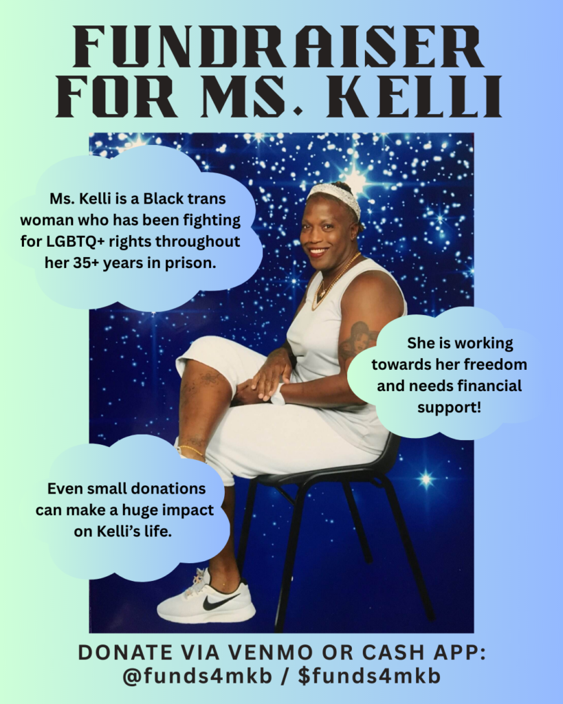 We’re hoping to fundraise $500 for Kelly over the next two weeks to help her buy books for school, cover legal fees as she works towards her freedom this year, and ensure her basic survival in prison. Even a small donation will make a big impact on Kelli’s life.